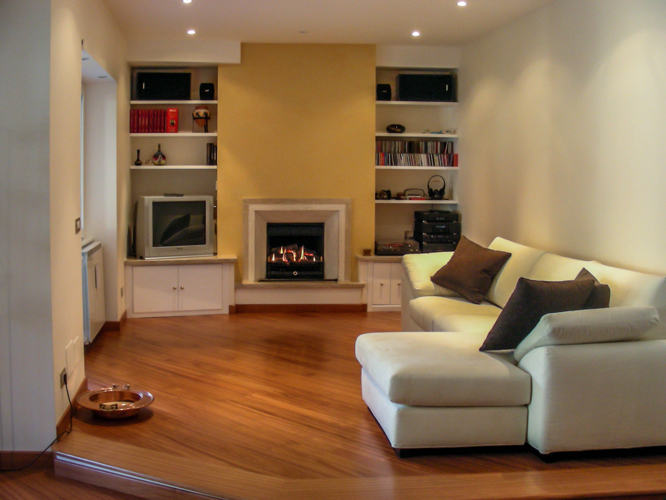 Si tratta in realtà di un intervento parziale che ha interessato solo la zona giorno per soddisfare la richiesta del cliente di inserire un camino a gas nel salone.