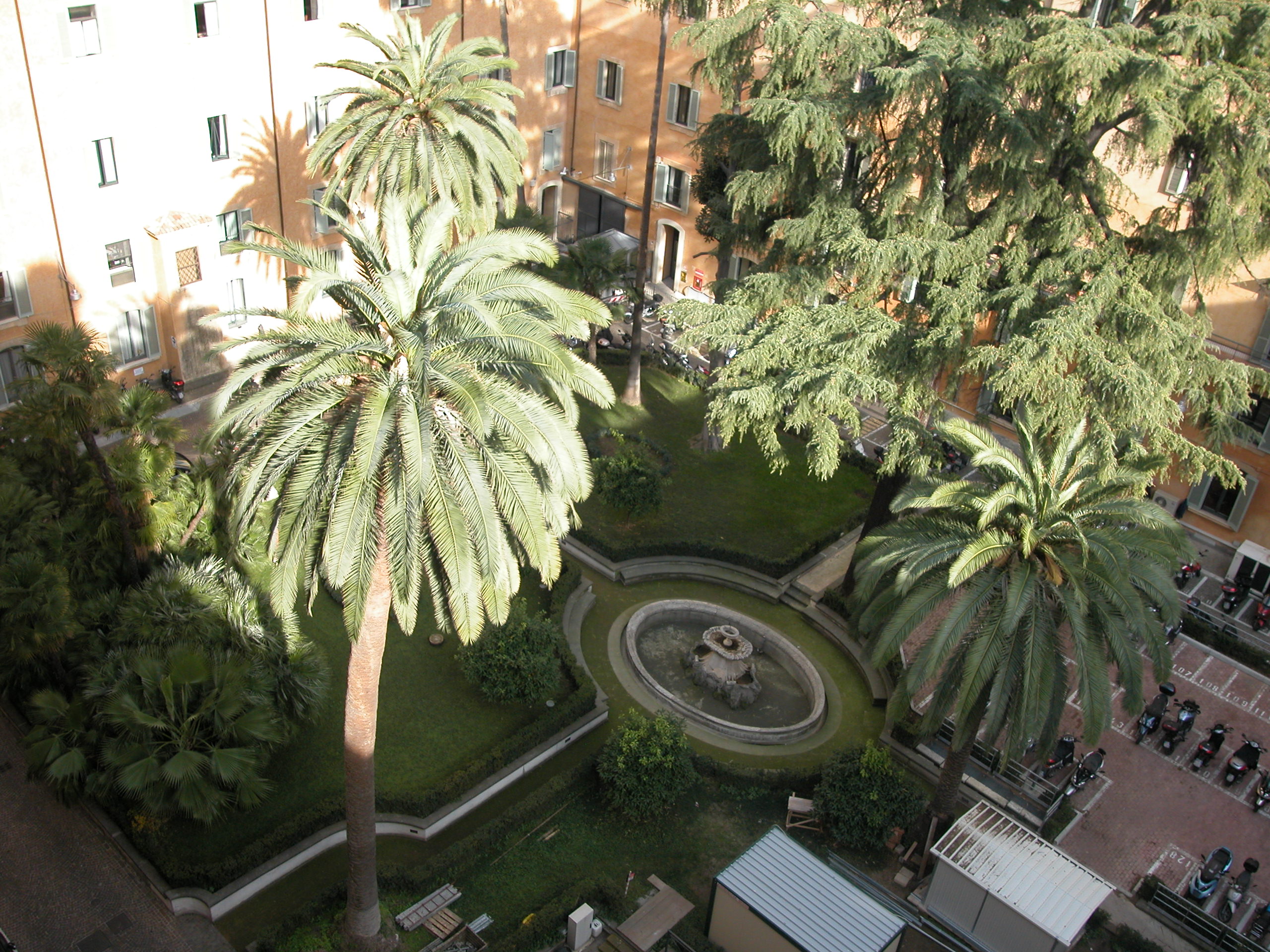 La sistemazione a verde dei quattro “parterre” è stata condizionata dal tipo di destinazione d’uso dell’edificio. Trattandosi di una biblioteca l’ambiente deve essere il più possibile silenzioso, e quindi era sconsigliabile scegliere un prato che richiedesse continui tagli con motofalciatrici. Inoltre, il prato così come lo conosciamo era un elemento estraneo nei secoli scorsi. Per queste due ragioni si è deciso di realizzare dei parterre con la convallaria (Ophiopogon Japonicus) nell’intento di ripristinare la naturale vocazione di questo cortile. Il tipico colore grigio-verde della convallaria, in abbinamento con il bosso (buxus sempervirens) e con l’arancio amaro  (Citrus aurantium), i cui frutti simili all’arancio non sono commestibili, sono elementi molto spesso presenti nel giardino storico a Roma.
