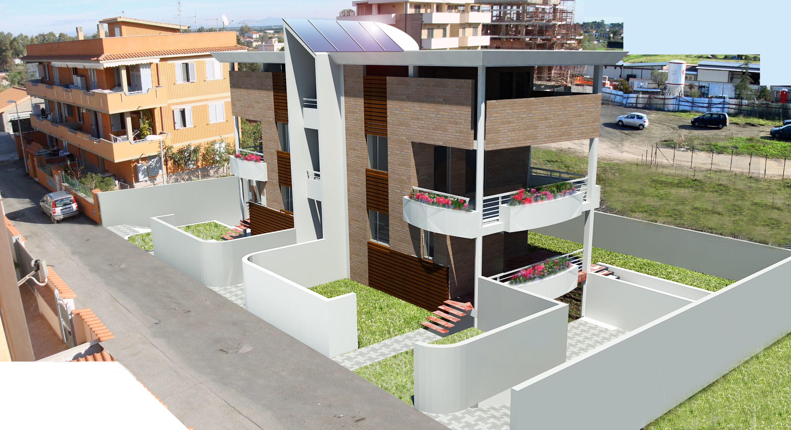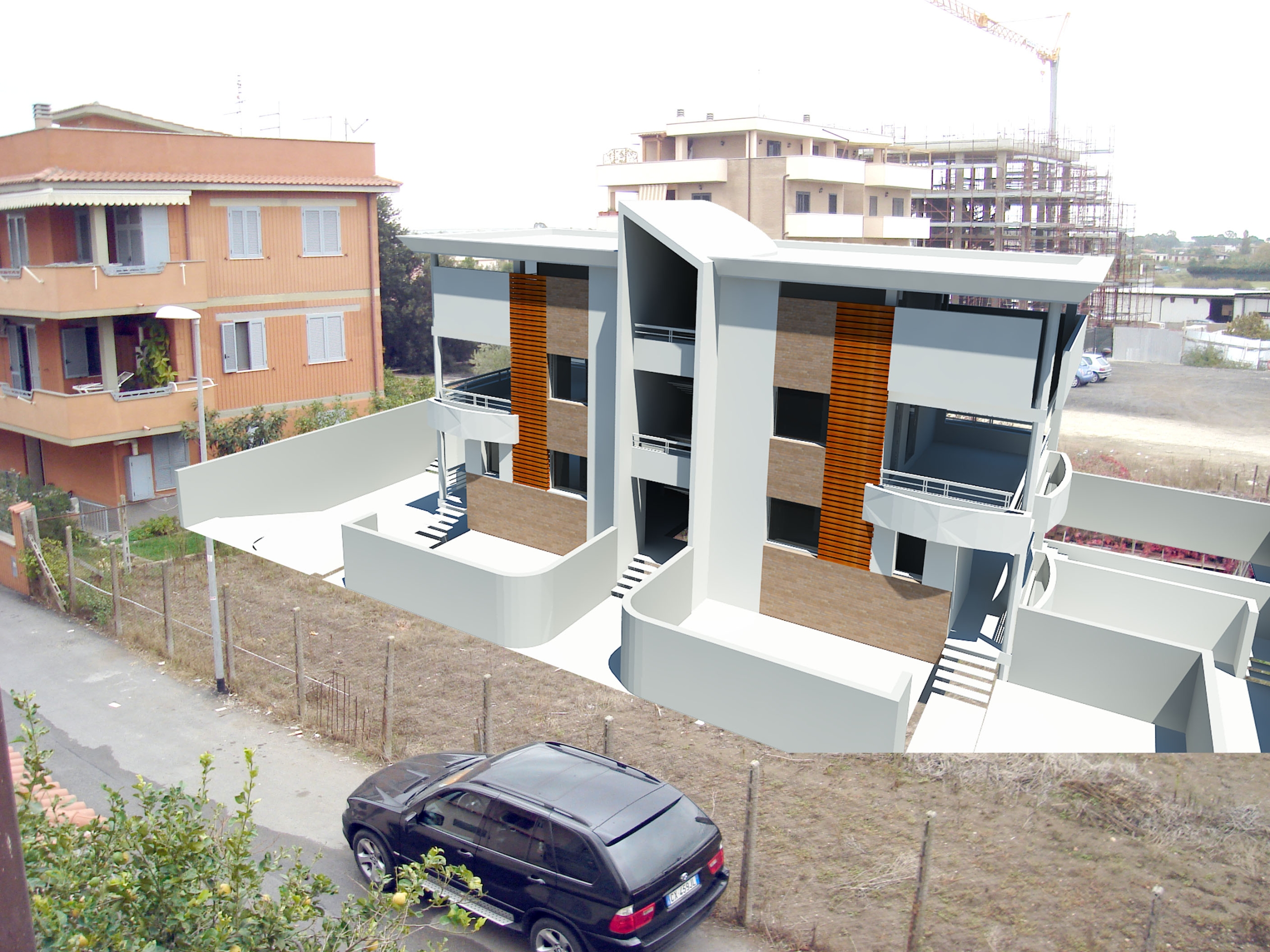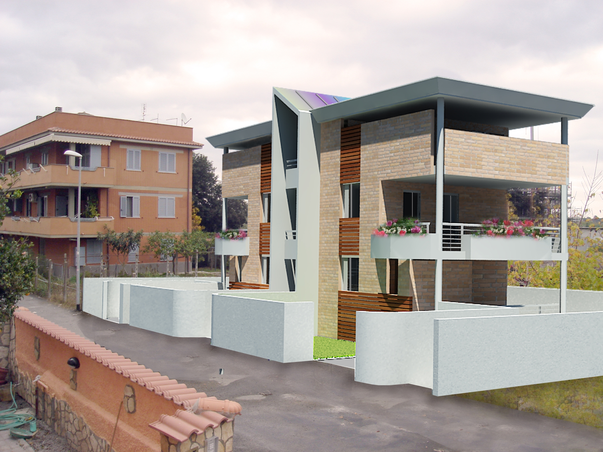 In un lotto di 600 mq ricadente in zona O (recupero urbanistico) a ridosso della Pineta di Castel Fusano, è stato progettato un edificio quadri-familiare di tre piani fuori terra, due residenziali e uno servizi, e un interrato con destinazione rimessa e cantine.