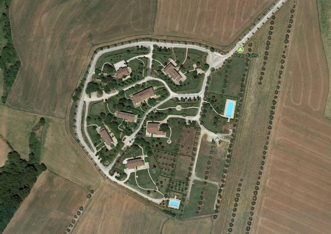 Il complesso residenziale denominato “Il Pino” è situato nel comune di Cortona, nei pressi dell’abbazia di Farneta, in cima ad un poggio che domina la Val di Chiana da cui si gode uno splendido panorama, che abbraccia Cortona, Sinalunga, Foiano della Chiana e Castiglion Fiorentino.