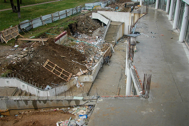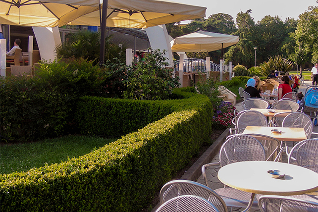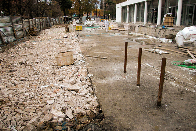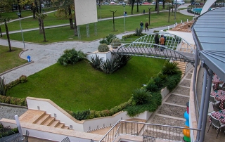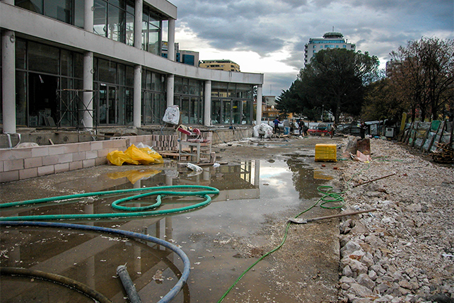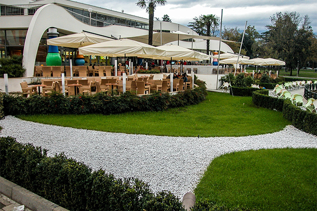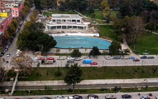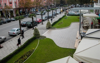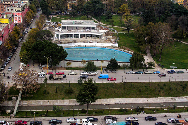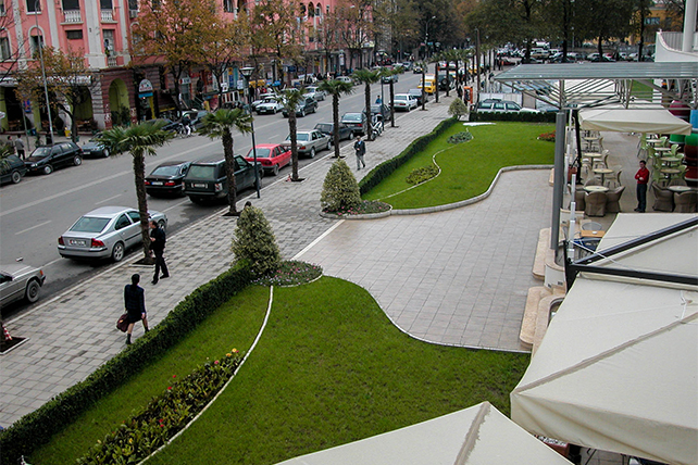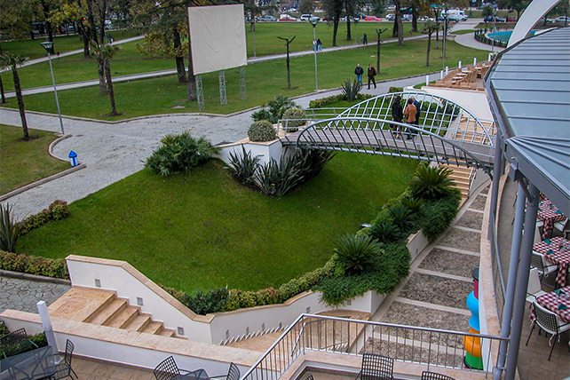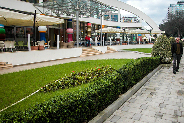 All’inizio degli anni duemila, il parco Rinia, al centro di Tirana, era caratterizzato dalla disordinata presenza di una moltitudine di bancarelle. Un committente privato ha realizzato un nuovo centro commerciale (Taiwan) che prende il posto di queste bancarelle. Il progetto dell’edificio ricalca uno stile eclettico, giocoso. Di conseguenza il nostro progetto delle aree verdi segue questo concept, per cui vengono riprese le forme sinuose dell’edificio con siepi di bosso (Buxus sempervirens) formate nello stile dell’ars topiaria con andamento ad onda. Queste forme sinuose si riflettono in una serie di aree curve realizzate con ciotoli bianchi che formano disegni sul prato.