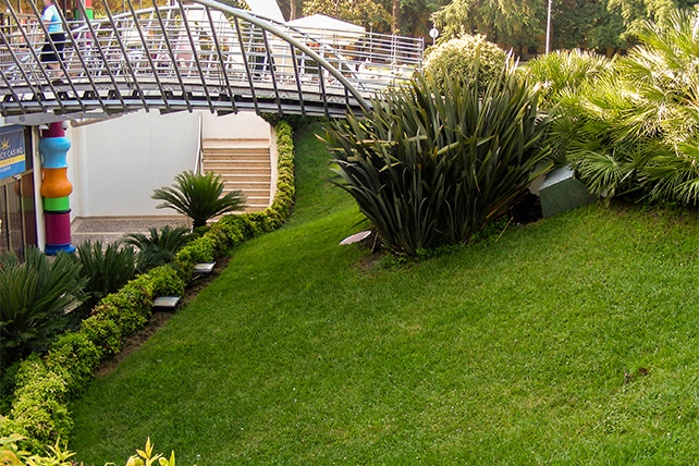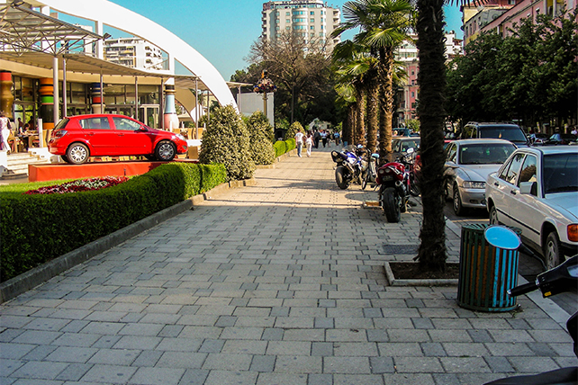 Gli ingressi al centro commerciale sono sottolineati dalla presenza di esemplari di Agrifoglio (Ilex aquifolium) formati a cono, mentre allo scopo di attutire l’impatto dell’edificio è stata disposta una siepe di Nandina domestica, caratterizzata dalla mutevolezza cromatica dei fiori bianchi, dei frutti rossi e della nuova vegetazione, anch’essa tendente al colore rosso. Il lato che confina con la strada di accesso è punteggiato da esemplari di palme (Chamaerops excelsa) che hanno un’ottima resistenza al clima invernale di Tirana. Per quanto riguarda il prato abbiamo scelto un miscuglio tipo “campo sportivo” che unisce valori estetici a una buona resistenza all’usura.